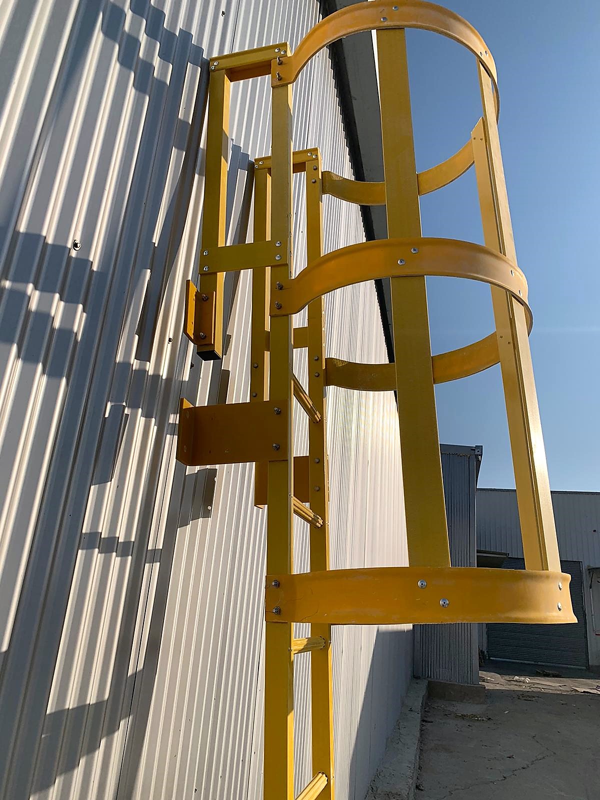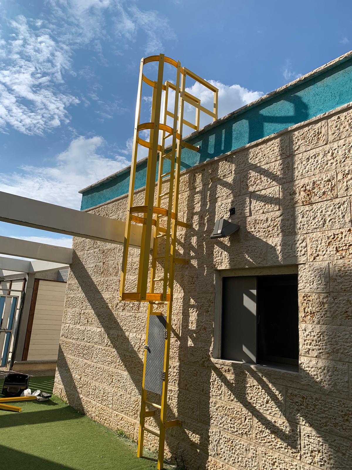 סולם פיברגלס קבוע עם כלוב הגנה ומעקה עליה לגג